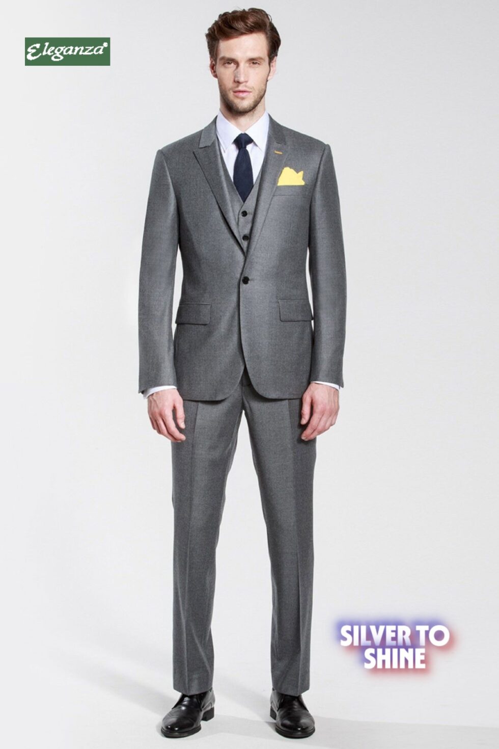 A luxurious three-piece suit in silver grey, hand made from a fine wool blend for a refined and modern look.