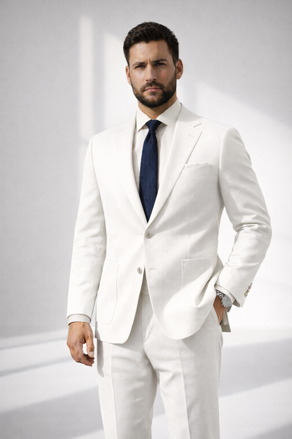 A premium navy blue formal suit with classic tailoring and modern fit, ideal for business meetings, weddings, and sophisticated occasions.
