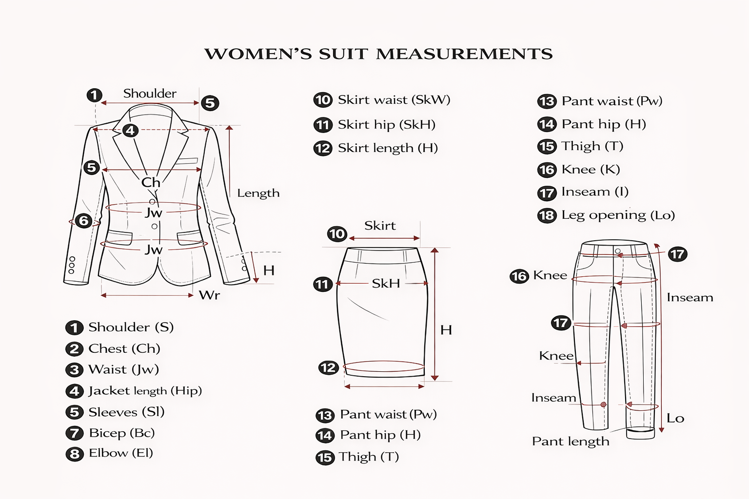 Measurements include Coat, Skirt, and Trousers for complete 3-piece accuracy.